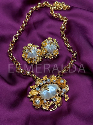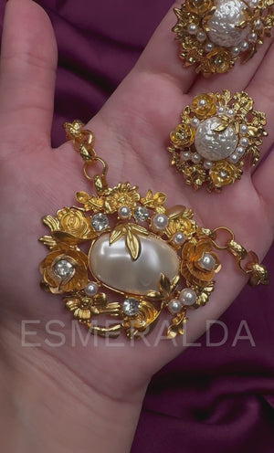 Indulge in the epitome of opulence with our Victoria pendant and earrings set, adorned in radiant gold and embellished with lustrous pearls. Each piece exudes a timeless elegance, evoking the grandeur of royalty and the allure of sophistication. Elevate your ensemble with these luxurious treasures, destined to be cherished heirlooms that capture the essence of regal refinement.